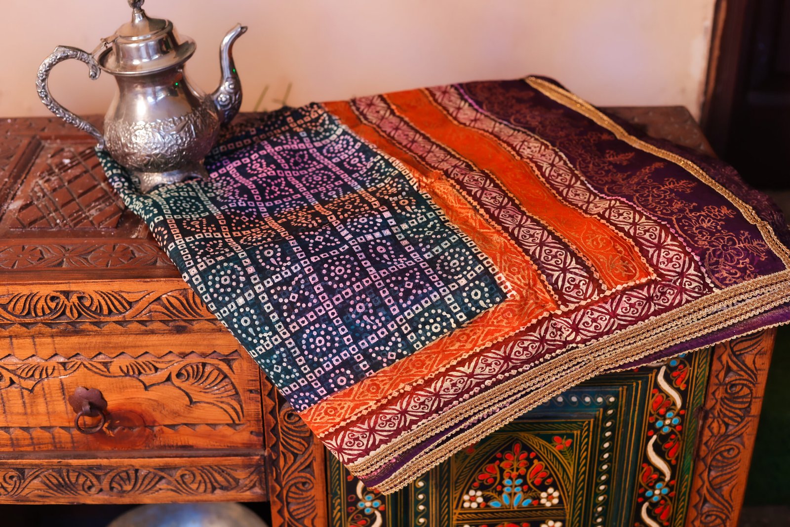 The design brings together deep jewel tones of indigo, maroon, orange, and earthy green, creating a striking contrast that feels both vibrant and grounded. Each section is thoughtfully printed by hand, making every piece slightly unique and full of character.