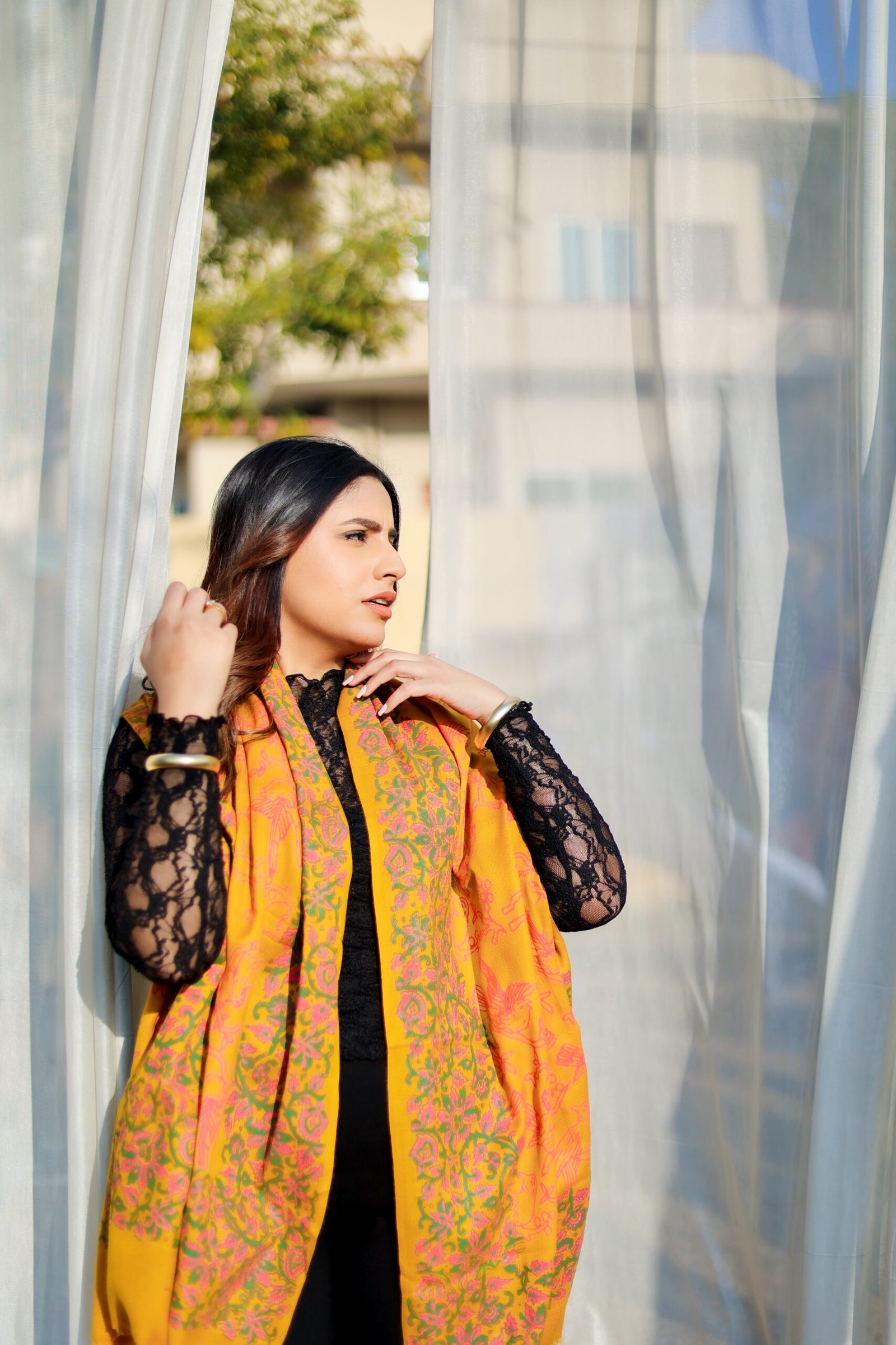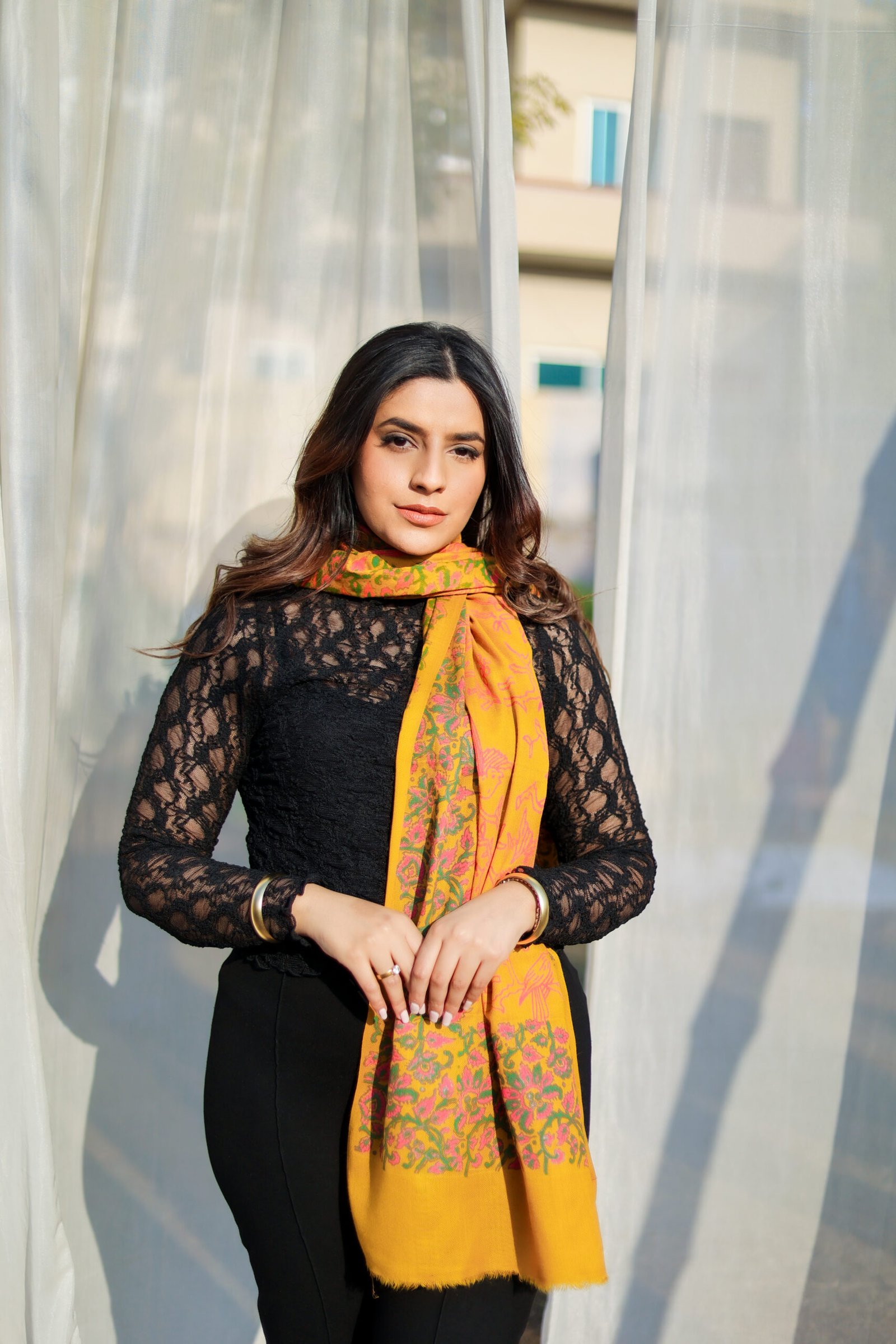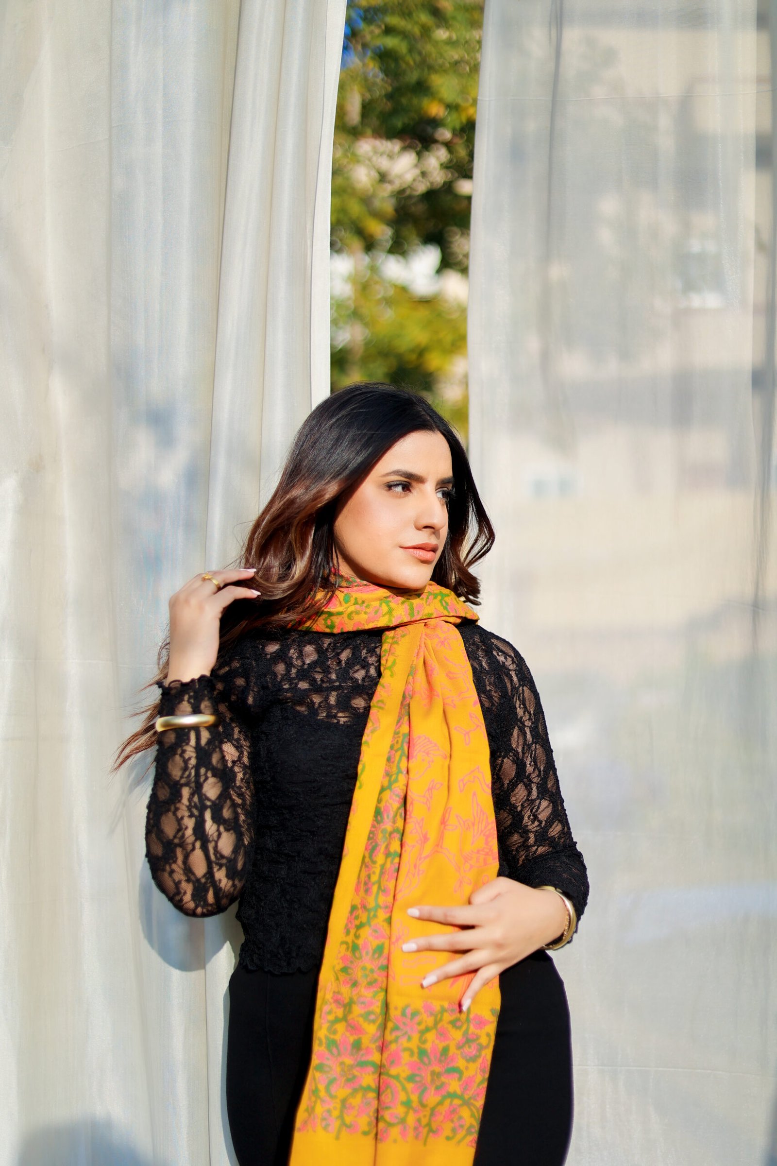 The Golden Noor Stole is a radiant expression of heritage artistry and graceful design. Set against a luminous mustard base, the stole is adorned with delicate all-over motifs in soft pink and leafy green, creating a harmonious balance of warmth and vibrance.