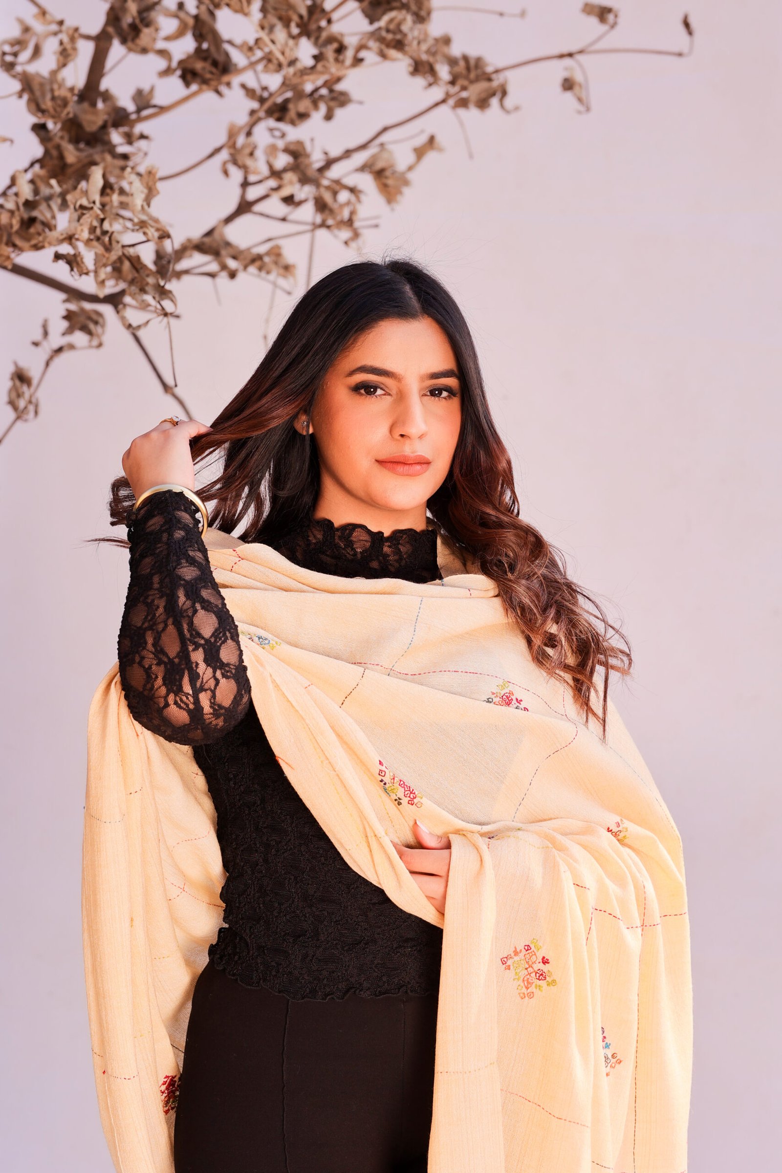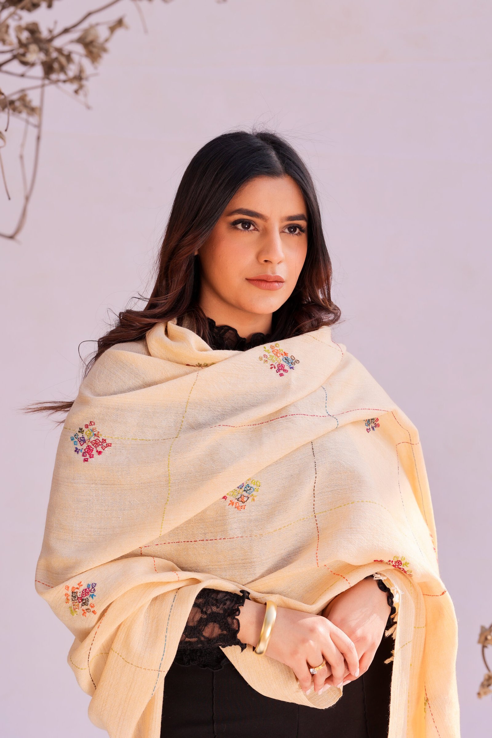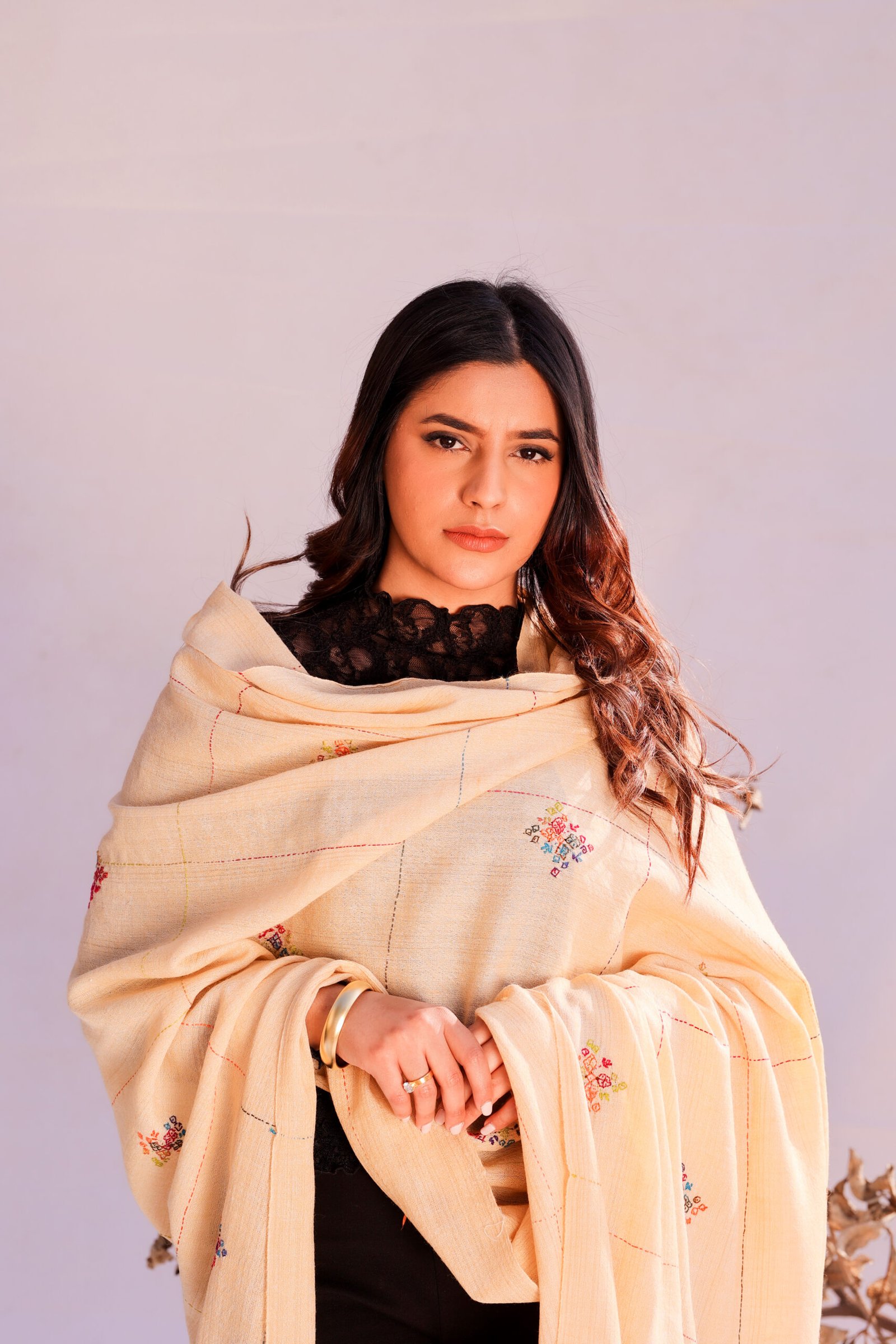 The Ivory Heritage Shawl is a refined expression of understated craftsmanship and cultural detail. Crafted in a soft, natural ivory tone, this shawl is adorned with delicate hand-embroidered motifs placed thoughtfully across the fabric. Each motif features subtle bursts of color, adding quiet character without overpowering the design.