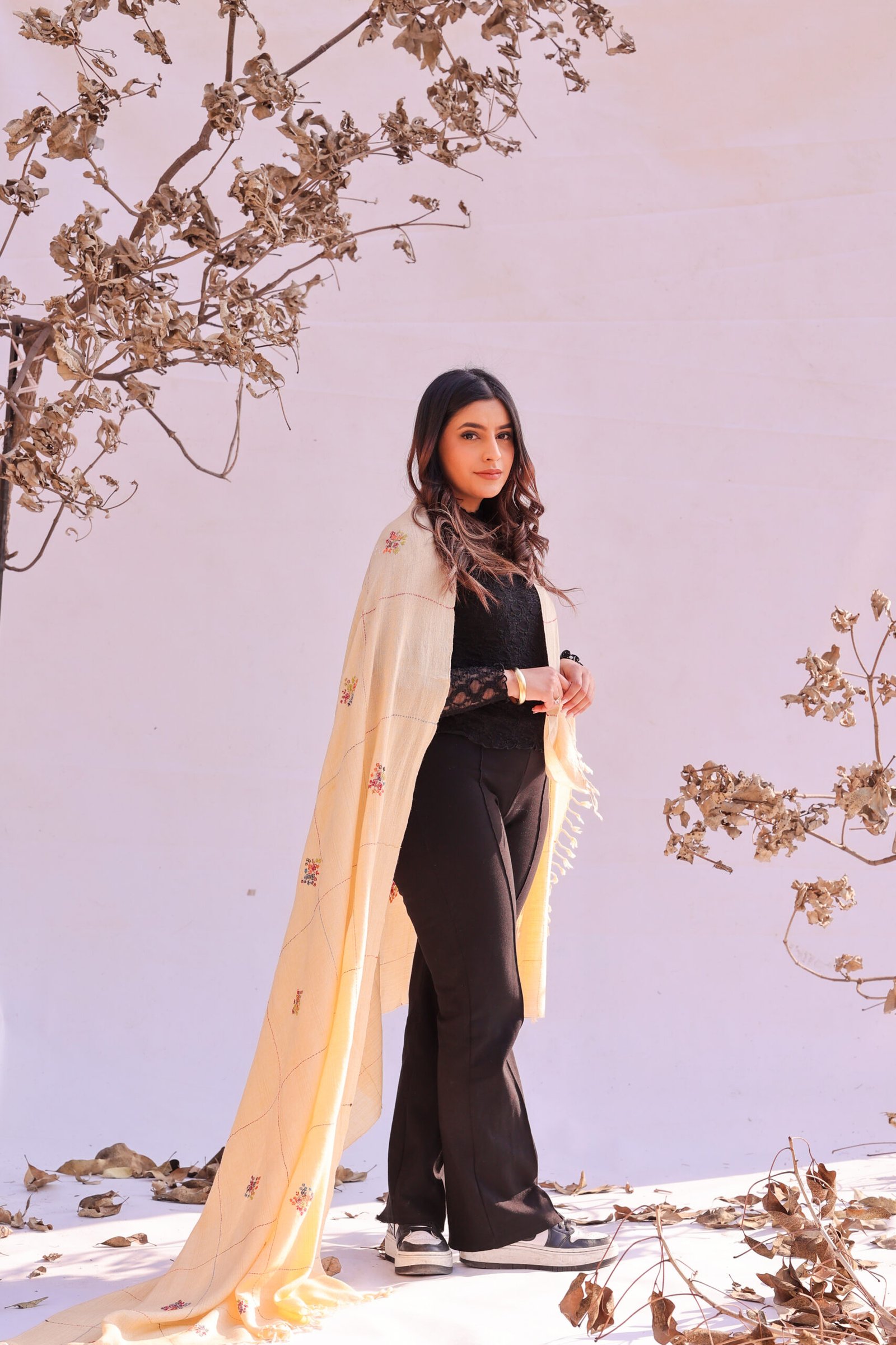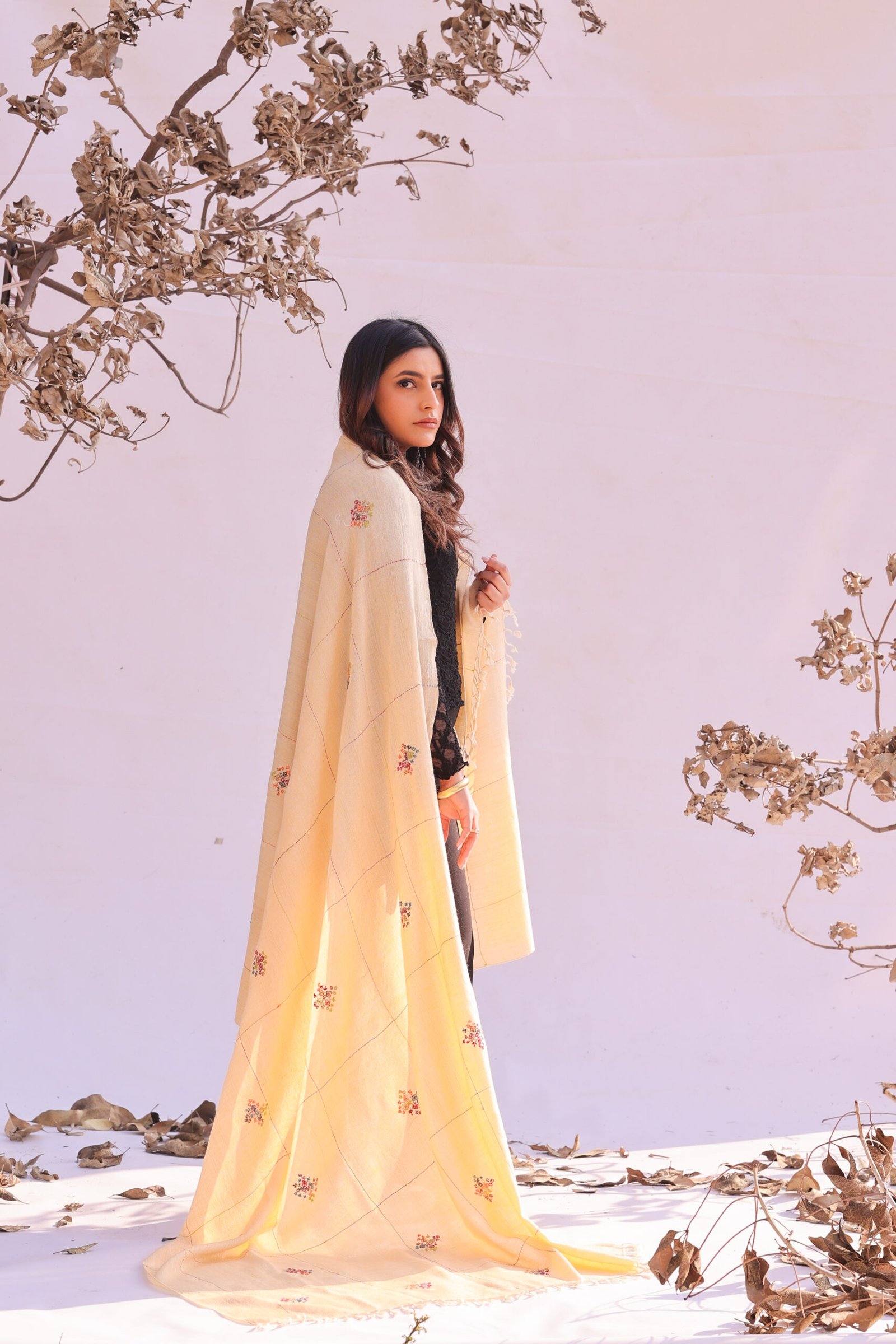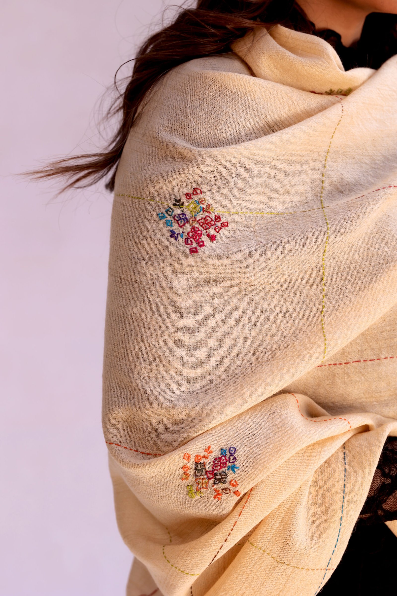 The Ivory Heritage Shawl is a refined expression of understated craftsmanship and cultural detail. Crafted in a soft, natural ivory tone, this shawl is adorned with delicate hand-embroidered motifs placed thoughtfully across the fabric. Each motif features subtle bursts of color, adding quiet character without overpowering the design.