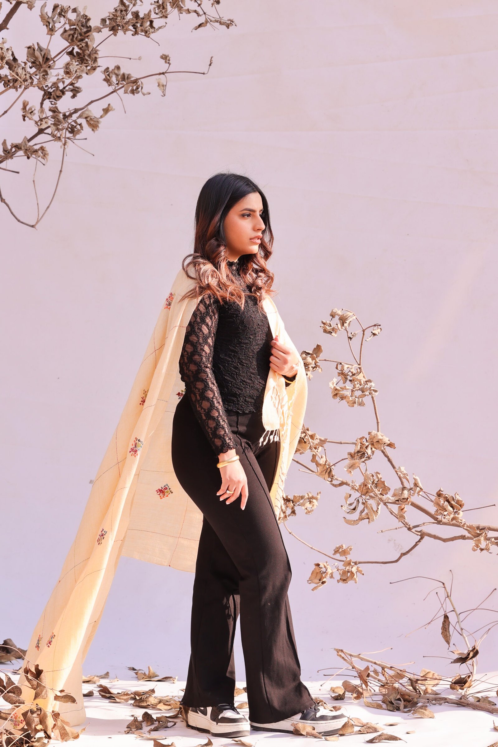 Fine running stitches trace gentle lines through the shawl, creating a sense of movement and structure while highlighting the hand-worked nature of the piece. The lightweight weave allows for a graceful drape, making it suitable for both everyday elegance and special occasions.