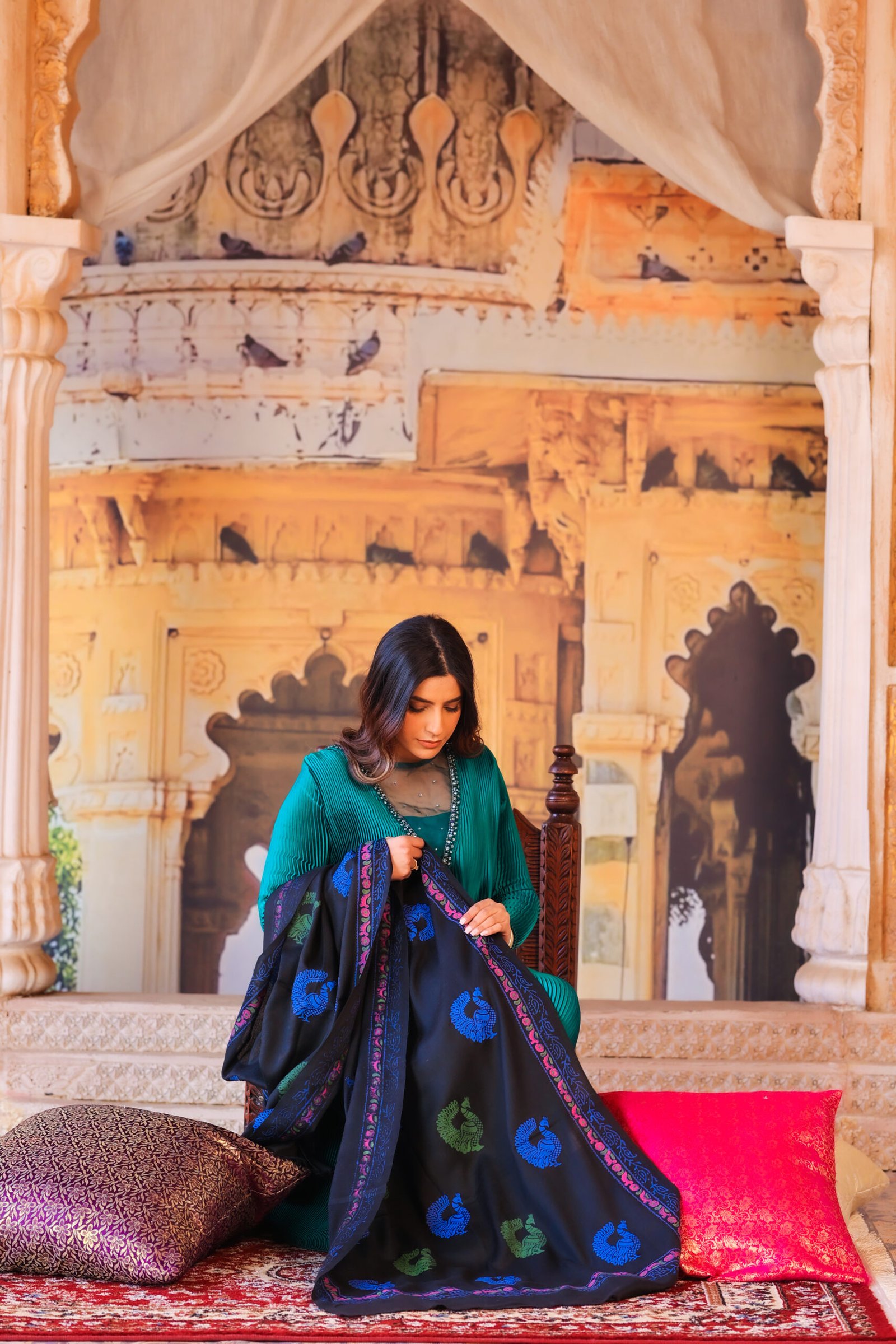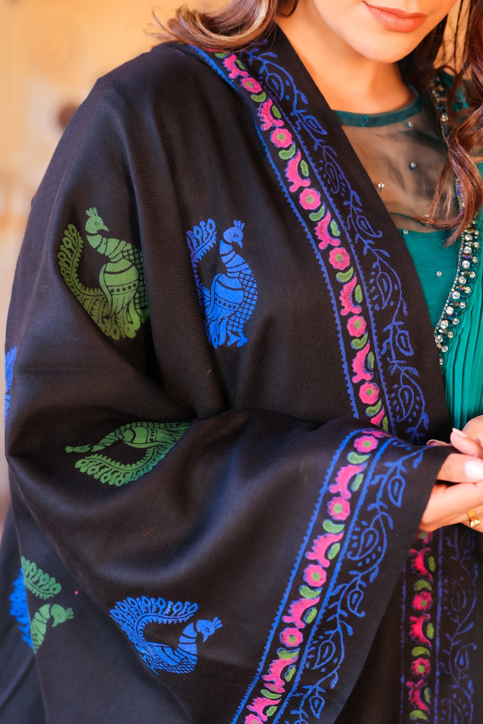 Mor Rang is a striking handcrafted stole that celebrates color, heritage, and movement. Set against a deep black base, the stole features elegant peacock motifs in vivid blue and green, symbolizing grace and renewal. A beautifully detailed floral border in shades of pink and blue frames the piece, adding rhythm and balance to the design.