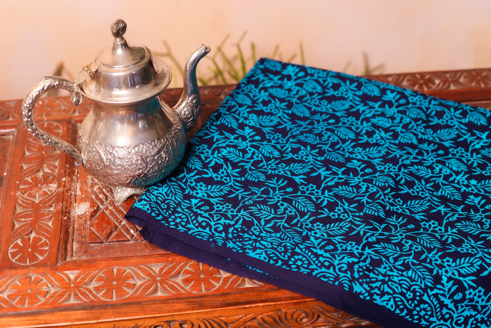 The Neel Garden Block Printed Stole is a striking blend of traditional craftsmanship and timeless design. Featuring intricate floral and vine motifs, this stole is hand block printed in vibrant turquoise tones against a deep navy base, creating a rich and visually captivating contrast.