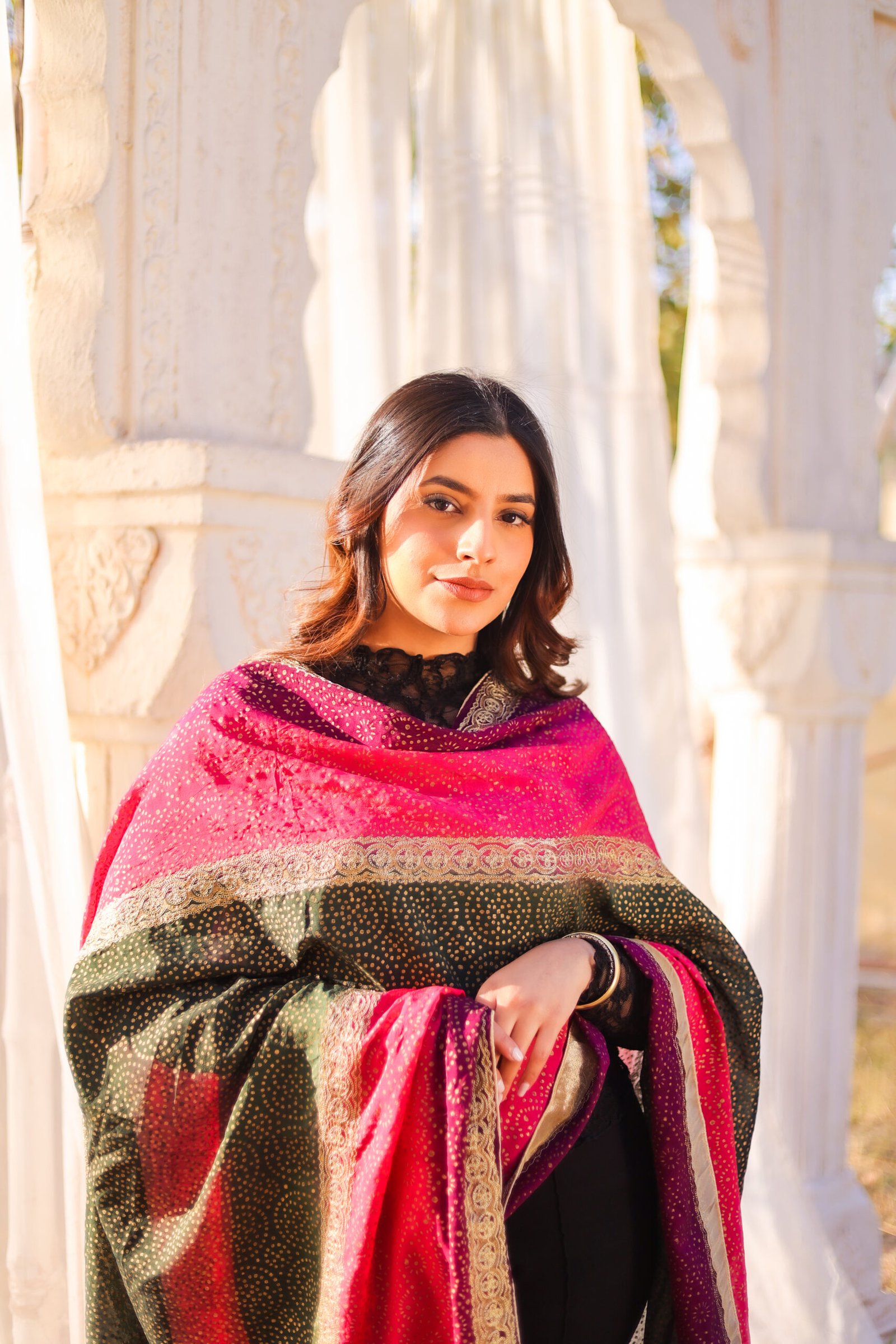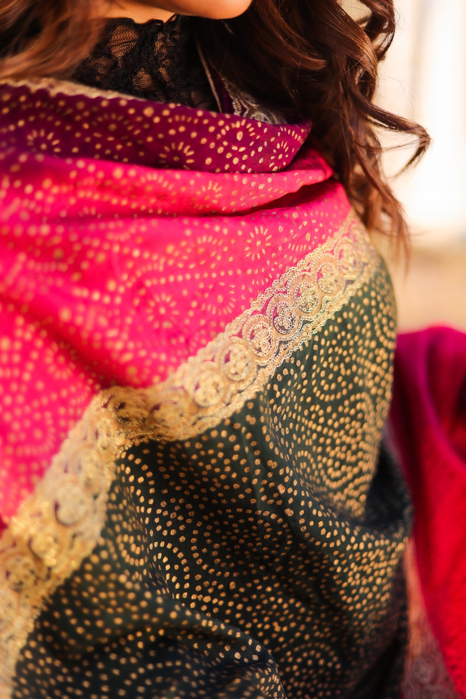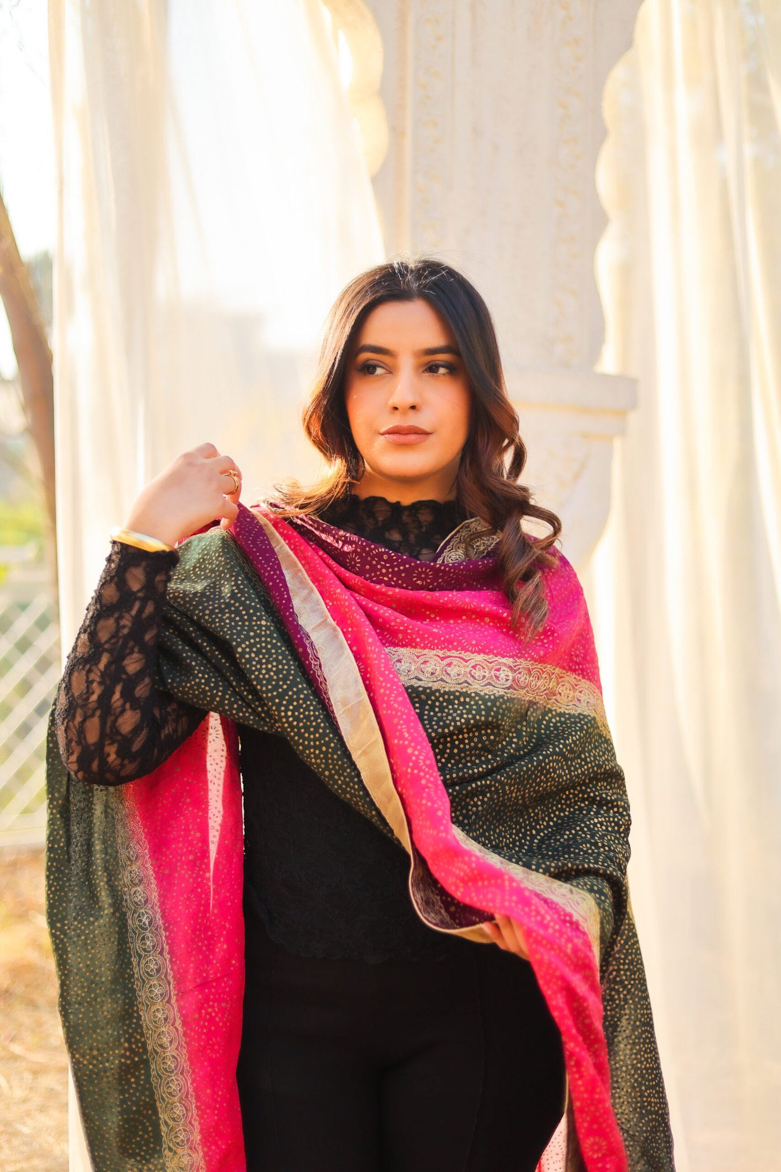 Noor-e-Rang is a vibrant expression of tradition reimagined through color and detail. Crafted on a soft, flowing base, this dupatta brings together deep emerald green and rich magenta tones, delicately adorned with fine golden dotted patterns that add rhythm and depth to the fabric.