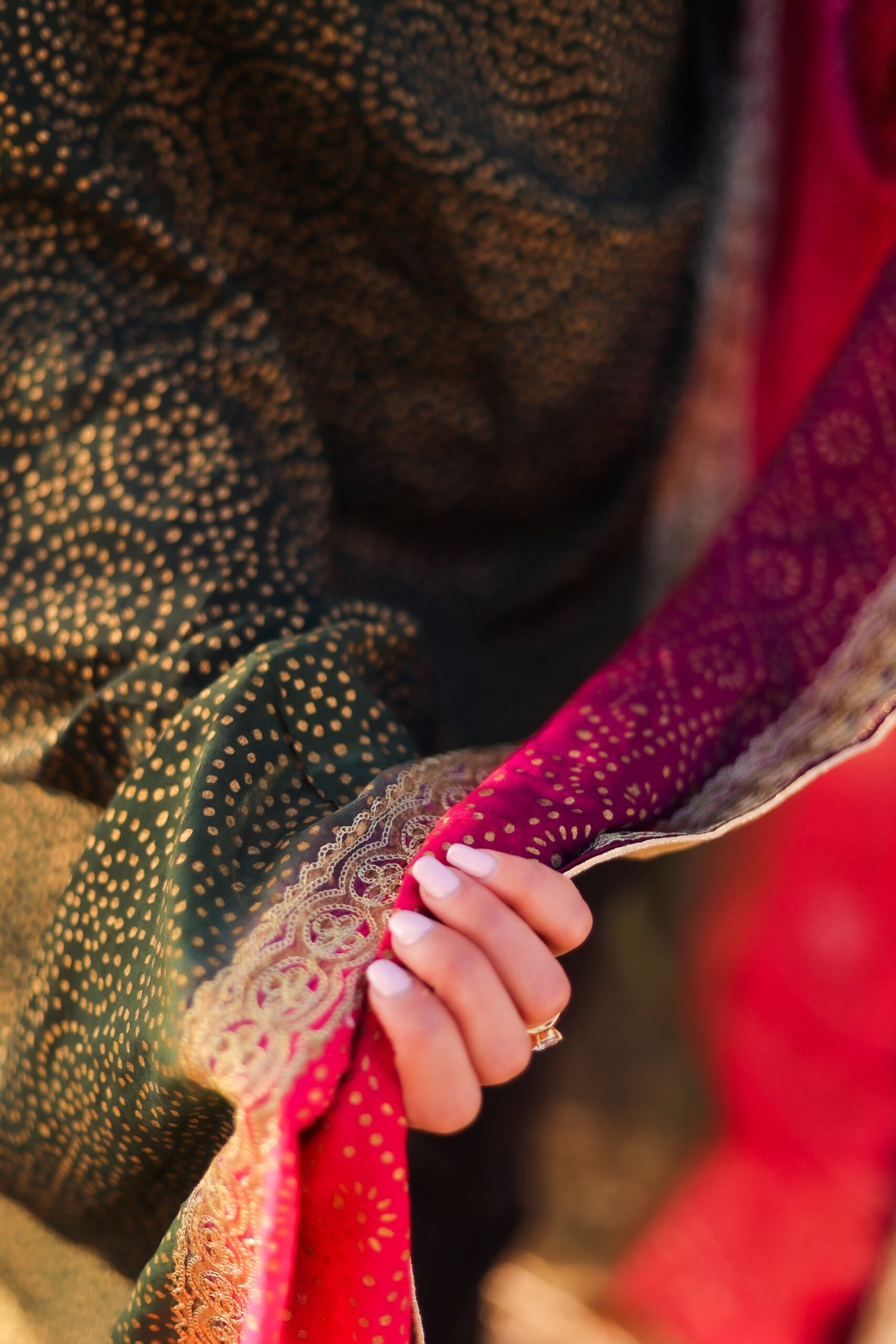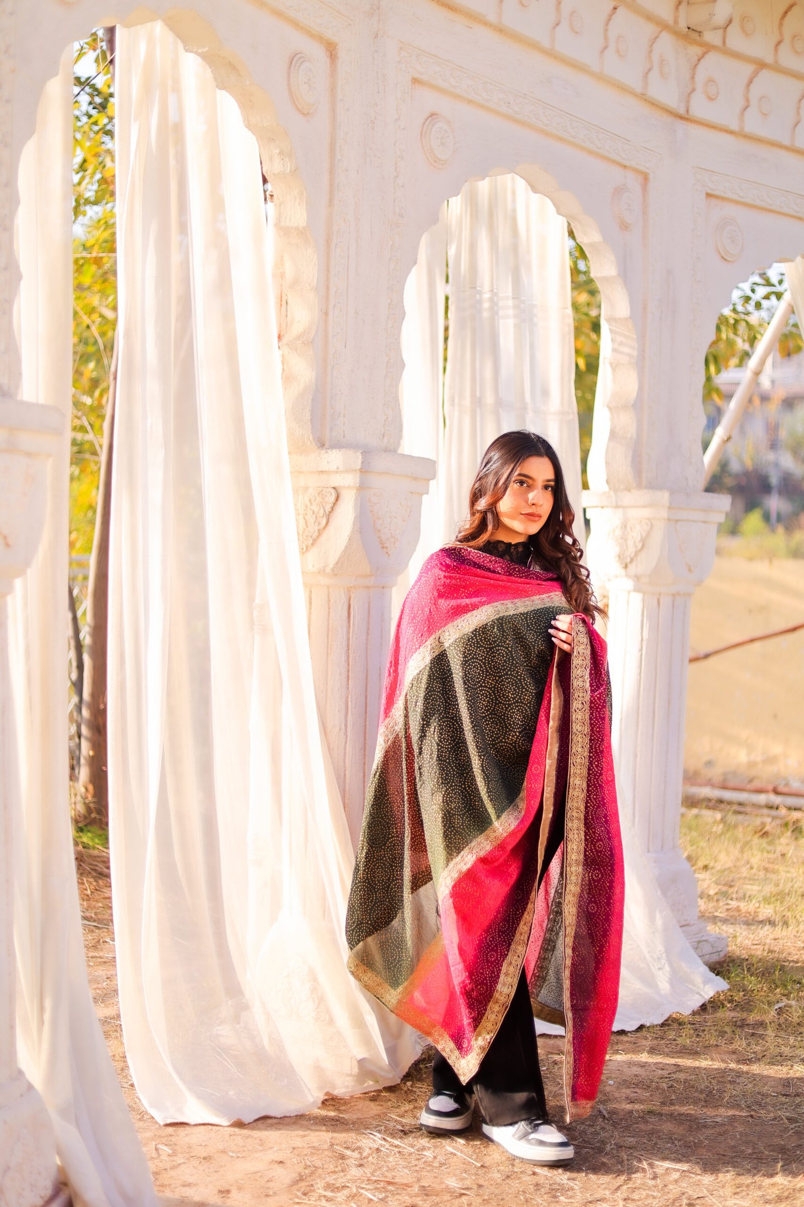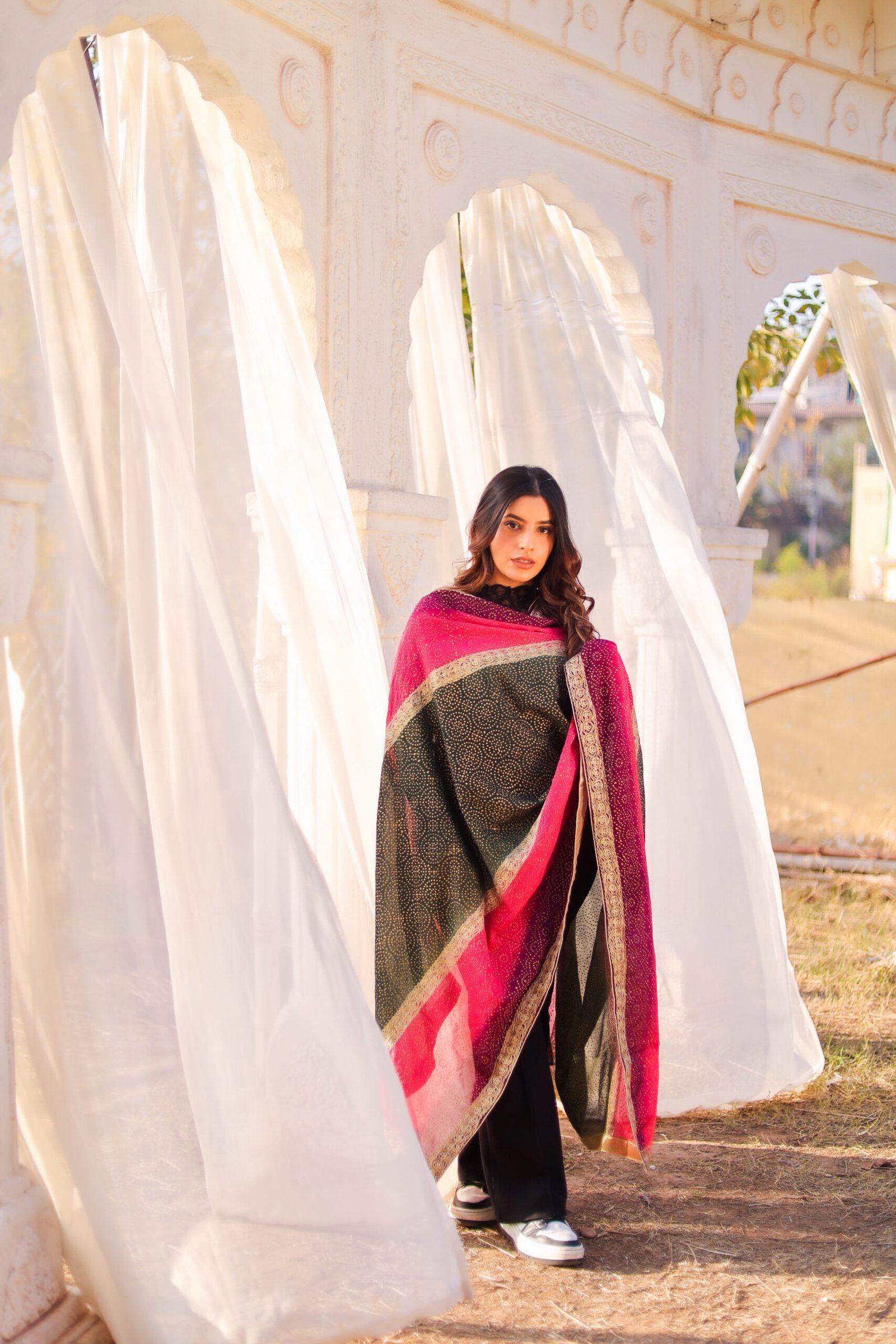 Noor-e-Rang is a vibrant expression of tradition reimagined through color and detail. Crafted on a soft, flowing base, this dupatta brings together deep emerald green and rich magenta tones, delicately adorned with fine golden dotted patterns that add rhythm and depth to the fabric.