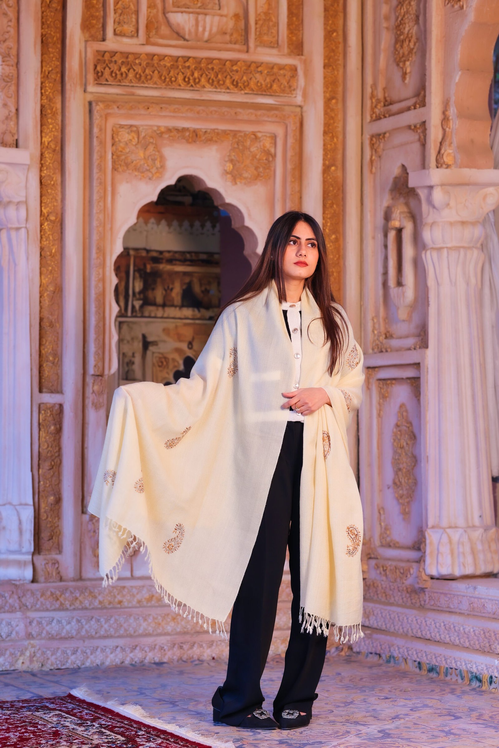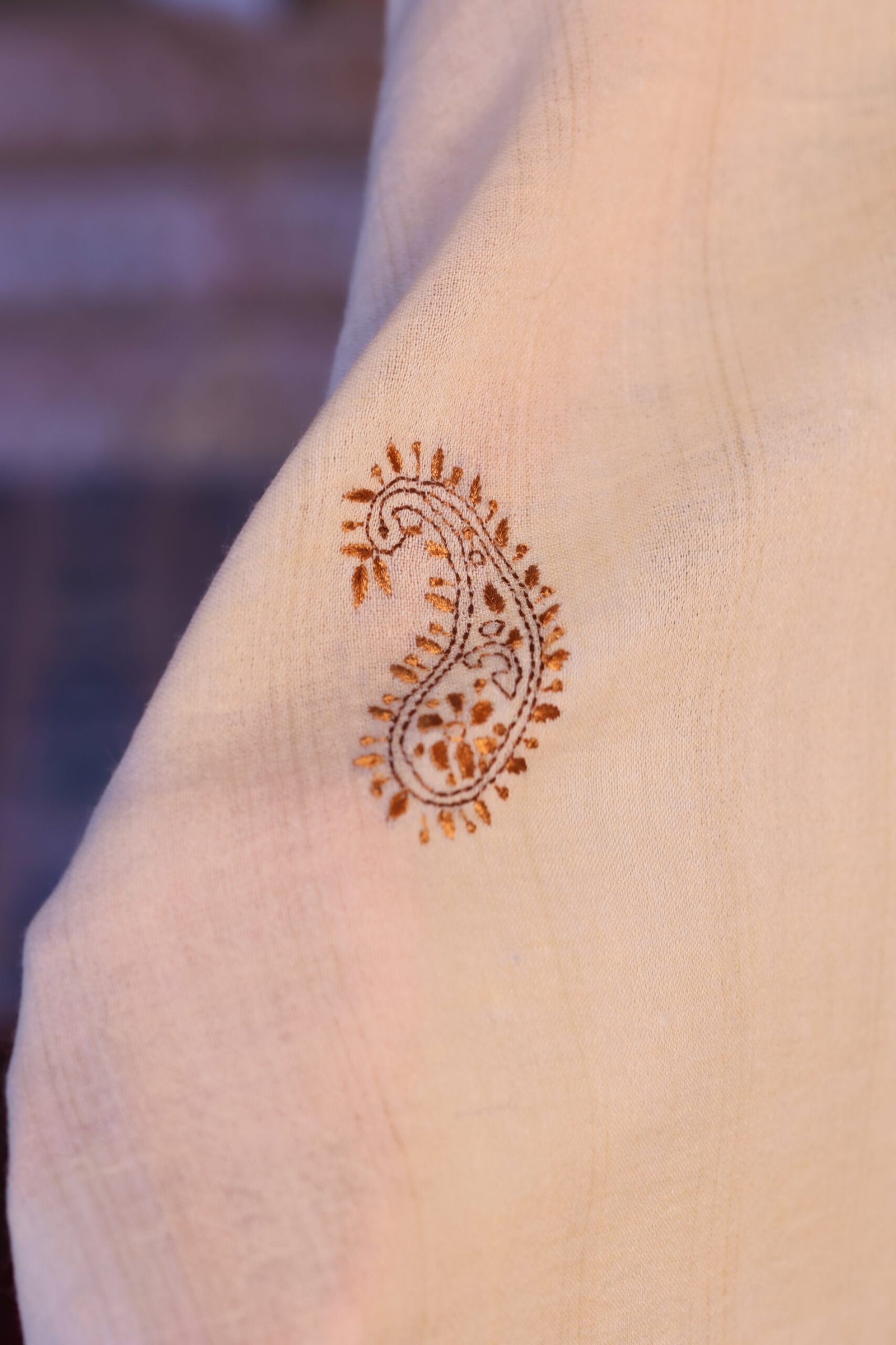 Zar-e-Paisley is a graceful handcrafted shawl that draws inspiration from classic paisley motifs and timeless tradition. Set on a soft, natural ivory base, this shawl features delicate hand embroidery in warm earthy tones, forming a subtle paisley design that reflects heritage and elegance.