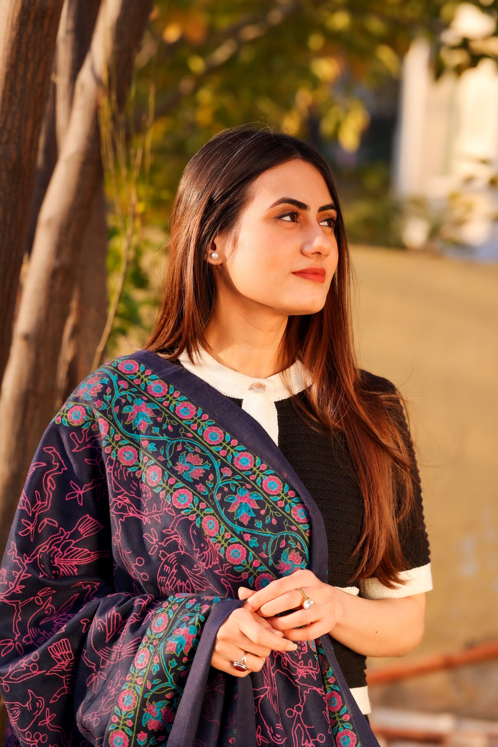 Zarqash Nightfall is a bold yet graceful shawl that blends tradition with quiet drama. Set on a deep midnight base, the shawl features intricate floral borders in teal and rose, paired with delicate bird and vine motifs printed across the body. The contrast between the rich dark ground and vibrant detailing gives the piece a striking presence without feeling heavy.