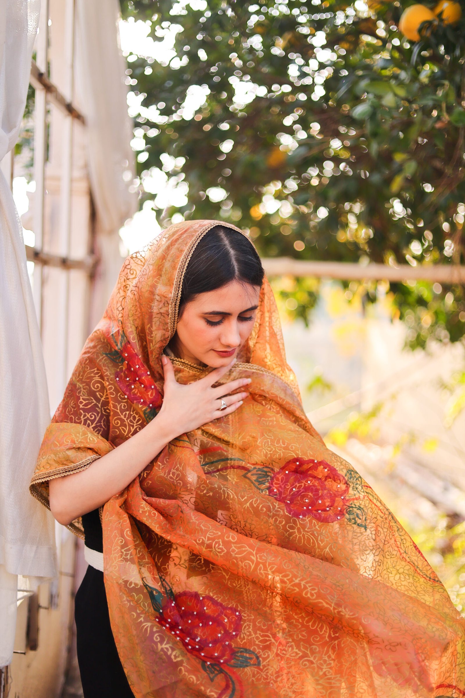 Zeenat-e-Bahar is a delicate celebration of color, craftsmanship, and feminine grace. Crafted on a sheer, lightweight base, this dupatta features a warm palette of amber, coral, and soft gold tones that flow seamlessly into one another, creating a luminous, airy effect.
